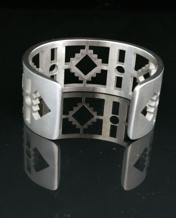 This bracelet is carved from stainless steel with a high-tech laser cutter.The geometric shapes are cut out to create a very pleasing design, with traditional shapes that have a contemporary flair.