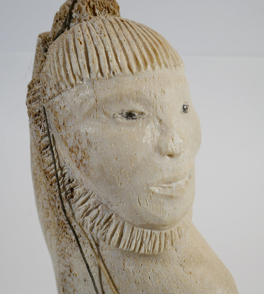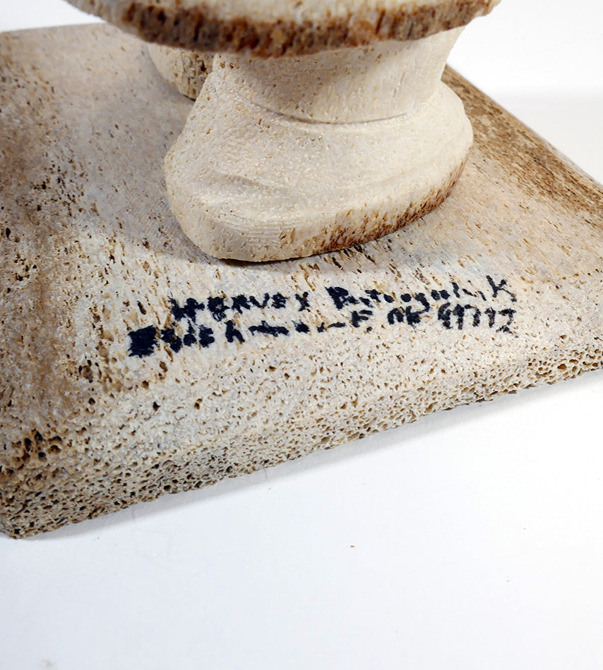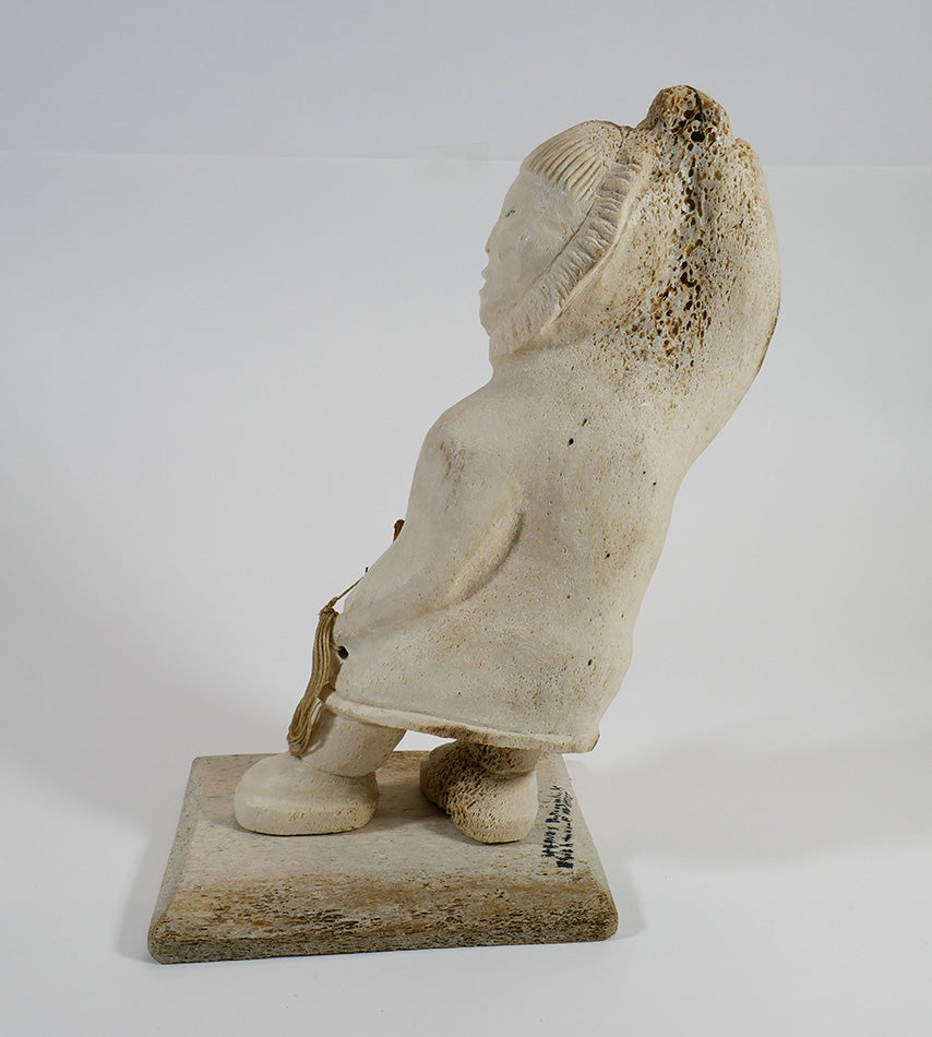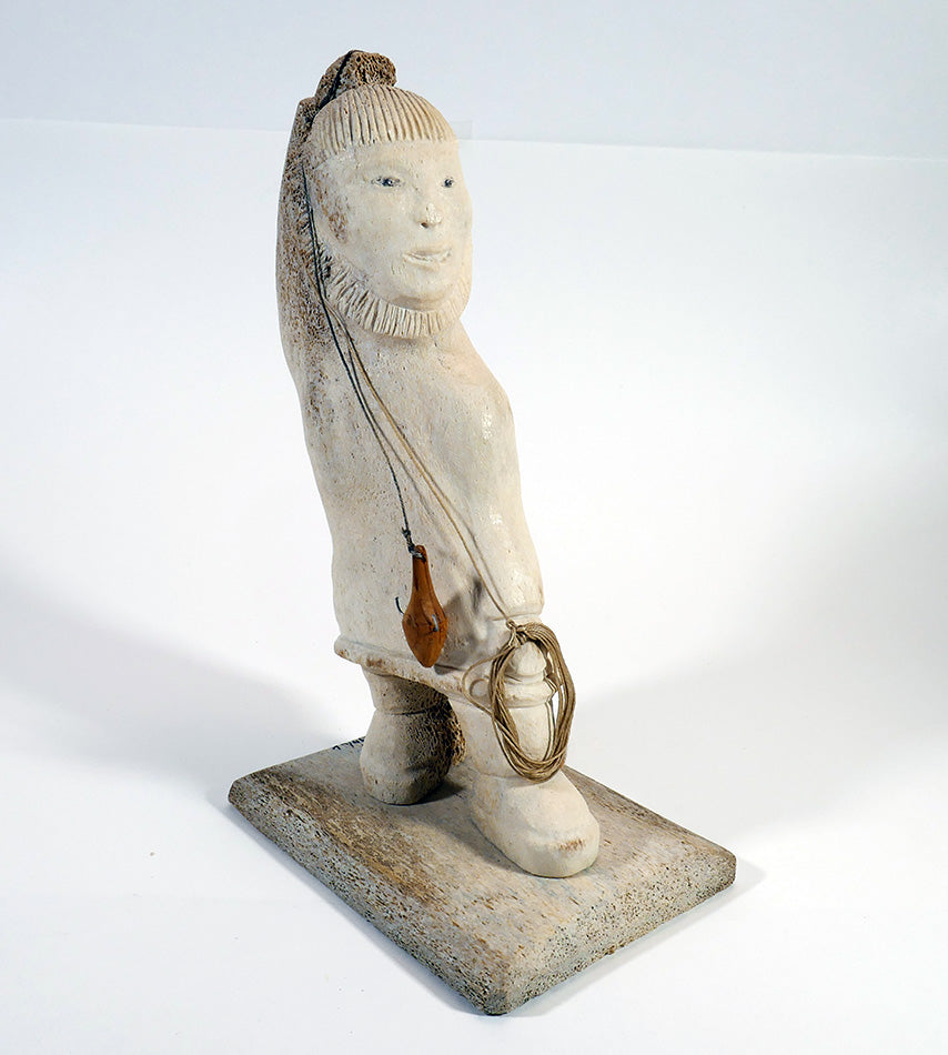 A lively sculpture of a fisherman ready to cast a lure, carved from bone by the late Harvey Pootoogooluk, Inupiat artist from Shishmaref, Alaska. The face is one of its best features, but it has an overall great presence.