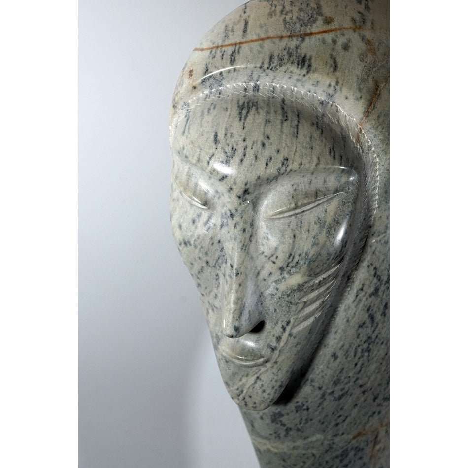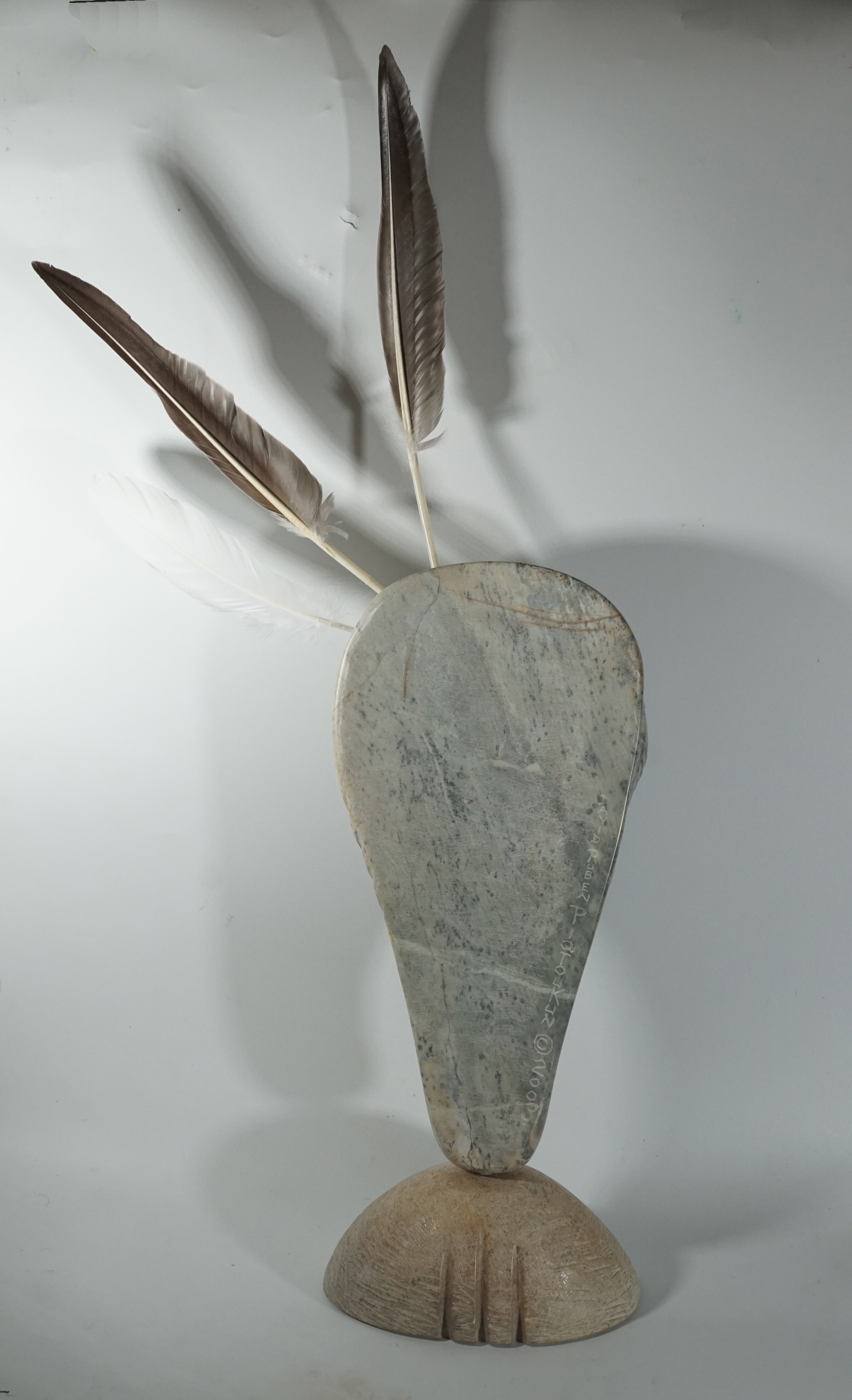 This mask, carved from beautifully hued Brazilian soapstone by David Ruben Piqtoukun in 20003, has three feathers crowning the head. Nesik represents wind and breath, and Sila represents the atmosphere, so we have a sculpture that pays tribute to those aspects of Mother Earth. The feathers, representing flight, fit the theme comfortably. The face embedded within the right eye is the spirit of the larger being.