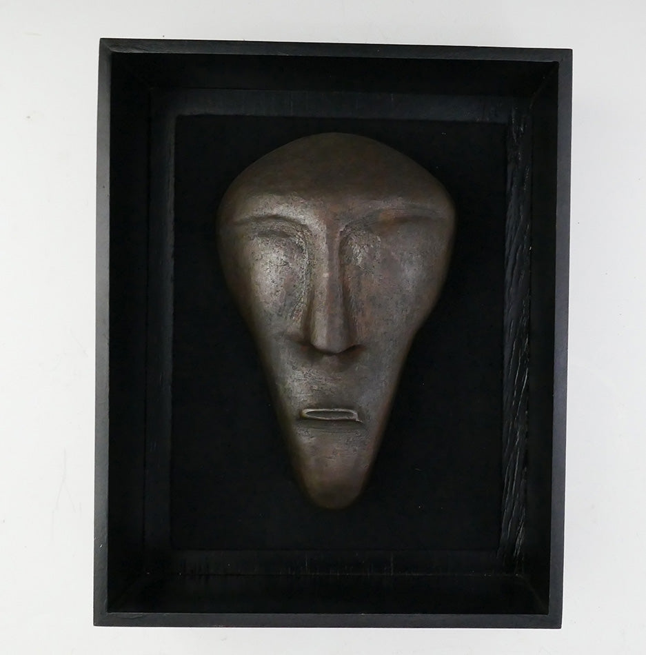 Three bronze faces by David Ruben Piktouqun Inuit sculpture