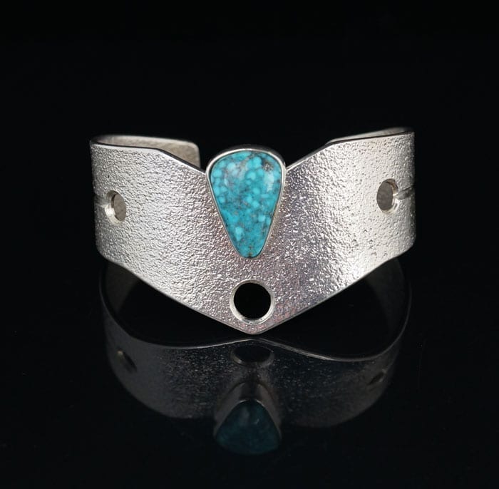 Sterling silver tufa cast bracelet with a turquoise cabochon with beautiful matrix. Round shapes combined with pointed shapes, circles and linear designs, add up to a stunning design.The bracelet will make a wonderful statement on your wrist!