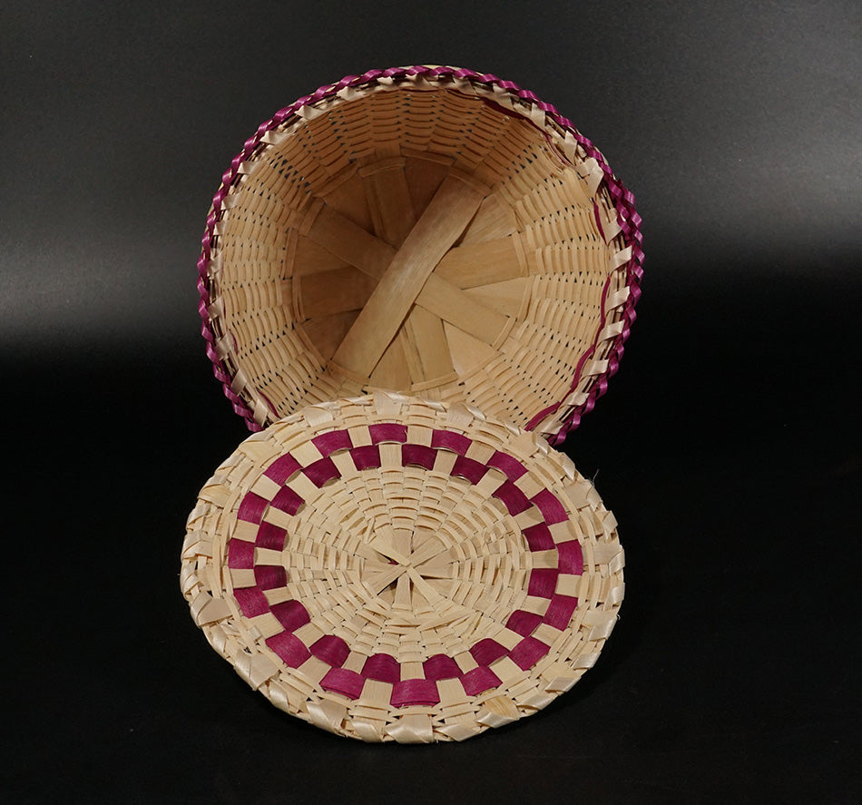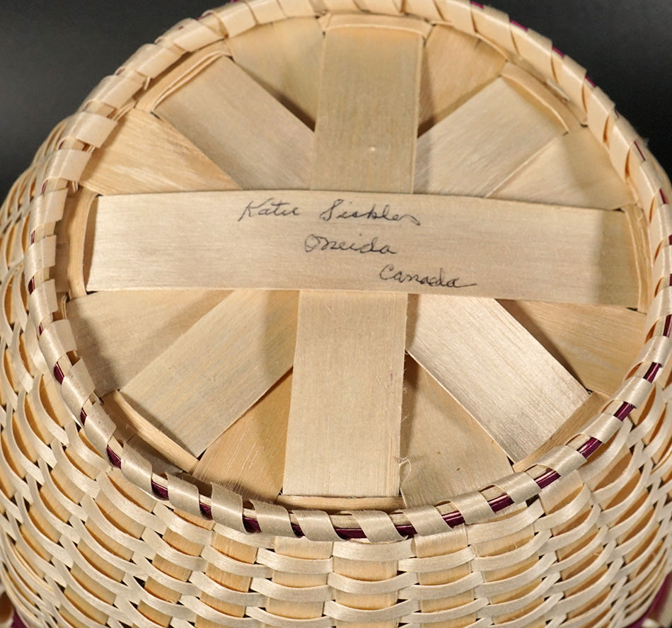 Katie Sickles (1920 - 2019) was a very talented and appreciated basket maker from the Oneida Nation in southern Canada. This basket, from a large collection of Native American/Canadian baskets, shows her skill in creating a delicate rim on her black ash baskets. The dyes have remained bright and the basket is in excellent condition overall.