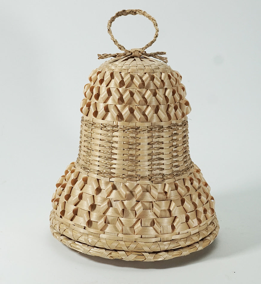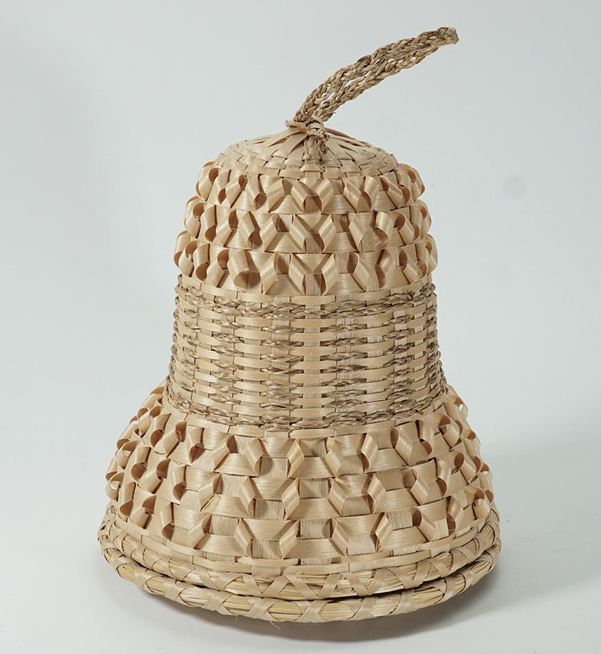 From 2003, we present a most interesting basket: a bell! Complete with a small basket inside representing the gong, this is an usual theme for a Wabanaki basket. Diagonal curls and braided sweetgrass complete the design.