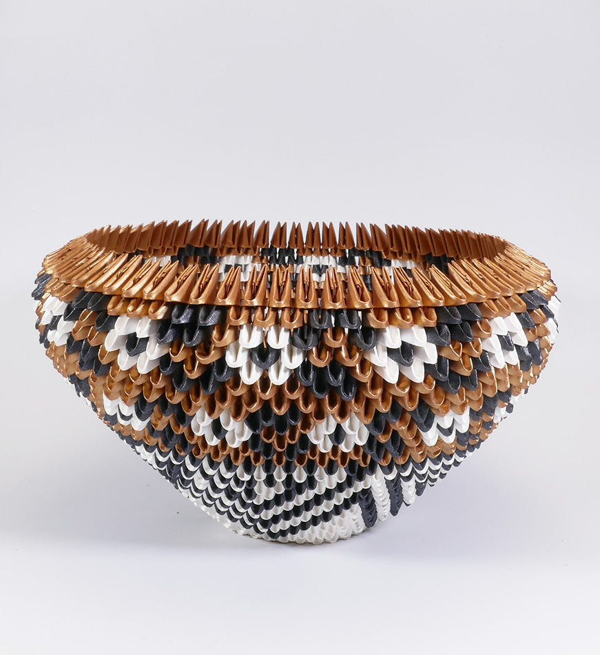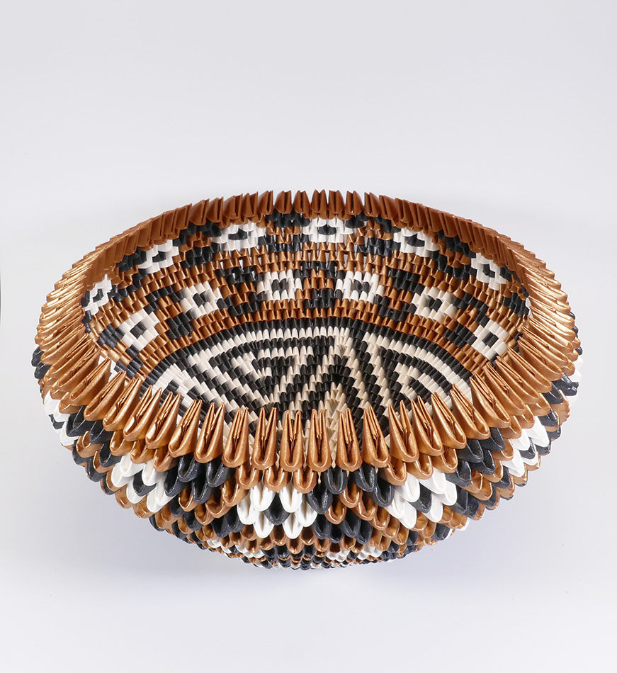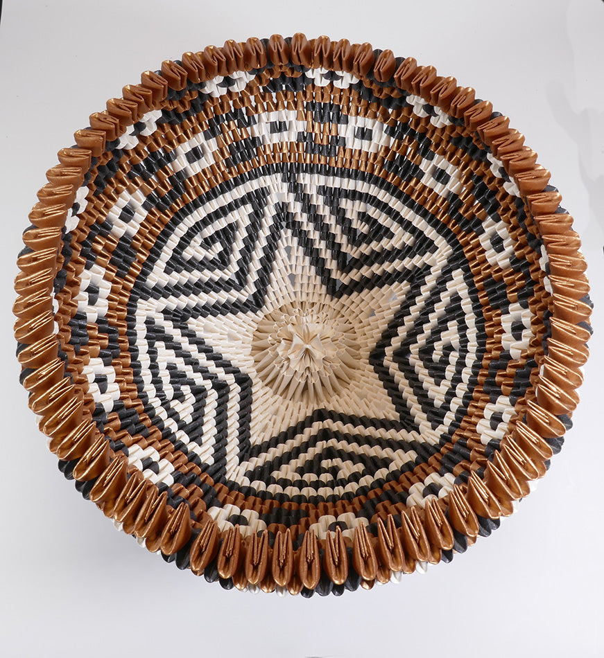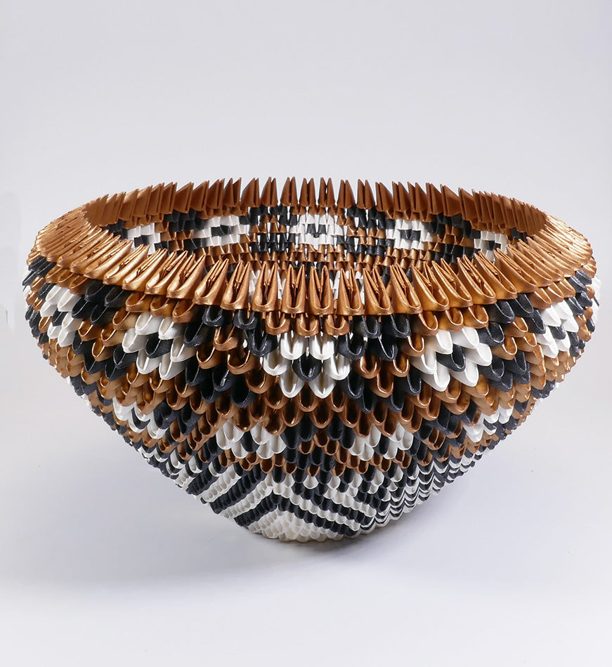 Rain Scott, from Acoma Pueblo, makes baskets from folded paper, origami style. While his technique is new and innovative, he pays tribute to the traditions of his people both in form (olla) and in design.