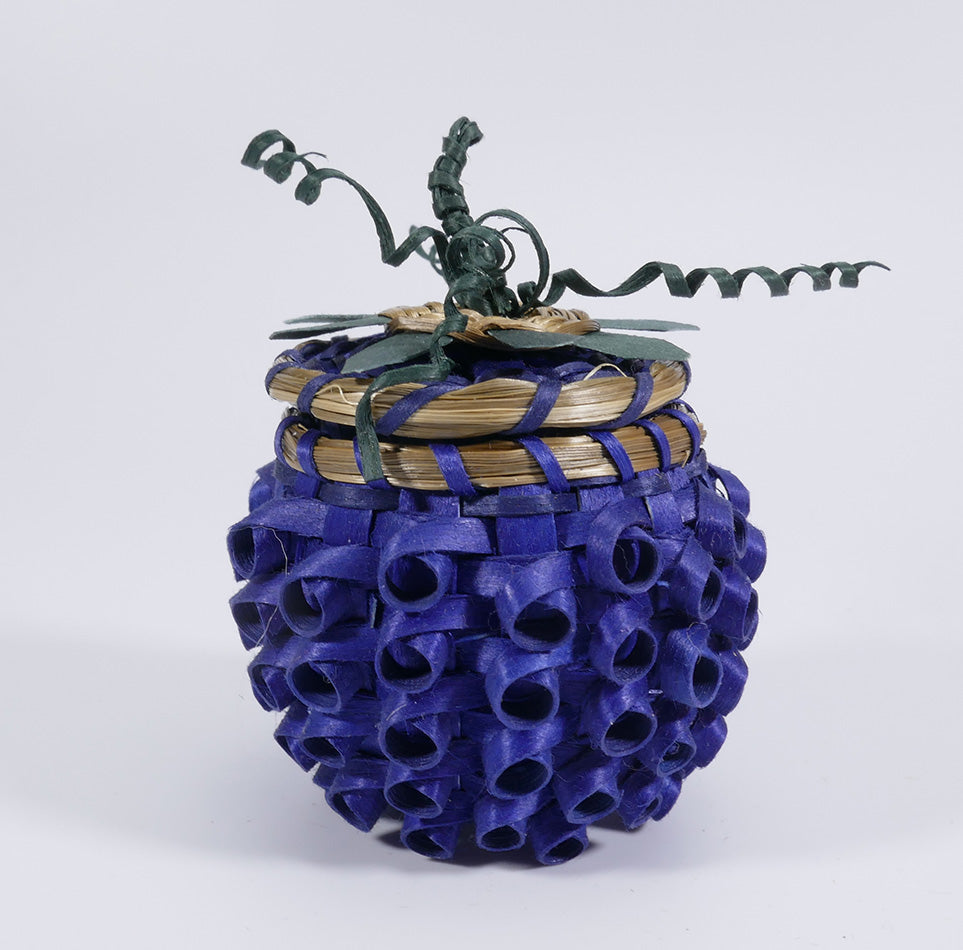 A charming miniature blueberry basket woven from black ash and sweetgrass with curlycues and fun foliage.