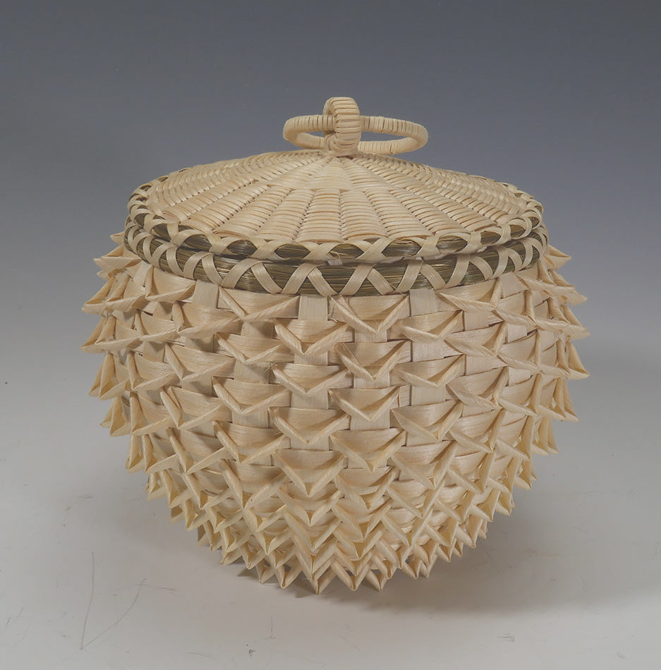 A tightly woven, attractive ash basket with points; sweetgrass touches add to the beauty. This is a traditional design among the Wabanaki tribes, and is a well executed version. The thin strands of ash (fine weave) on the cover and base of the basket add a special, more elegant touch to the traditional design.