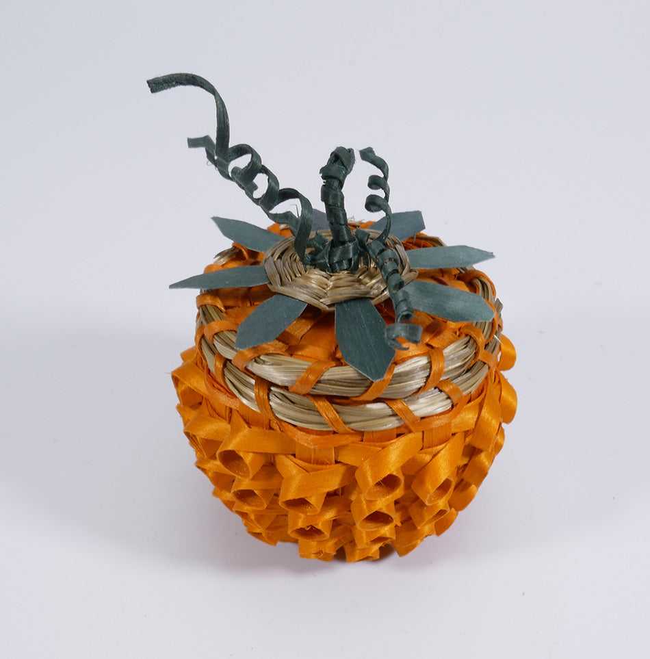 A charming miniature pumpkin woven from black ash and sweetgrass with curlycues and fun foliage.