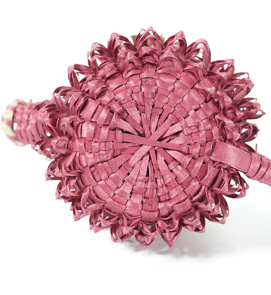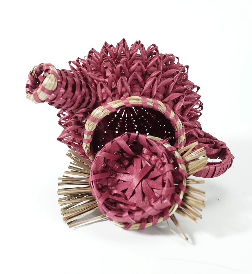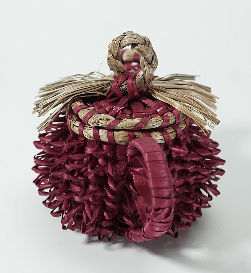 A charming acorn basket, woven from black ash and sweetgrass, in the shape of a raspberry colored teapot.