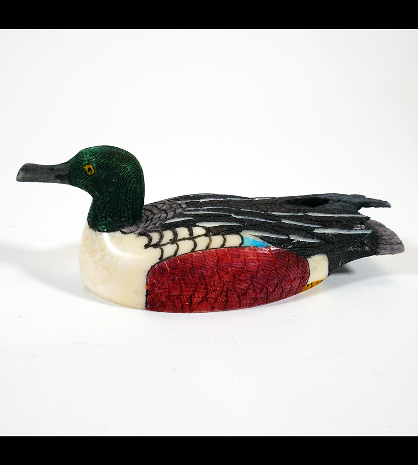 Tad Mayac Jr comes from a family of distinguished Alaskan Eskimo ivory carvers. This is a well-executed shoveler duck. The carving is excellent and the scrimshaw coloring is as well.