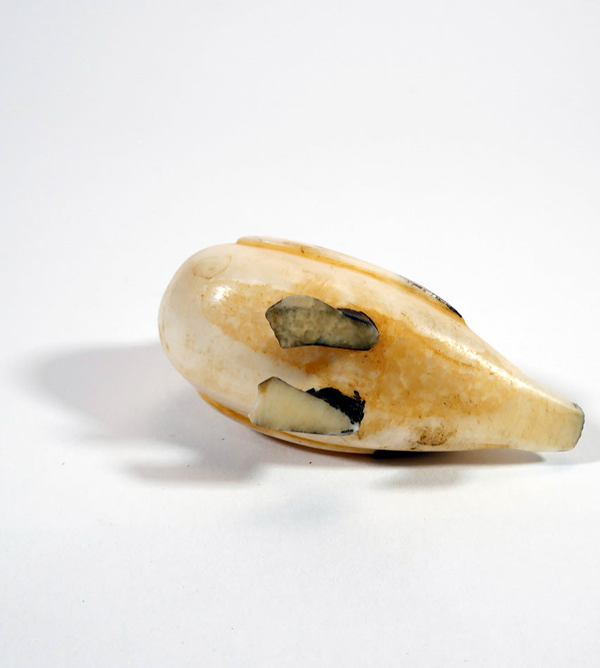 Carved from two pieces of walrus tusk, this lovely goose was has scrimshaw features. Circa 3rd quarter 20th century.